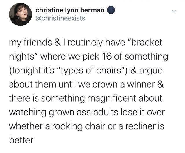 Welcome to Highly Recommend! What an honor that you care enough about the things I love to subscribe to a whole freakin' newsletter about them. (And congratulations on making it through January, it seems deeply unfair that the first month of the year also lasts an entire year, doesn't it?)
